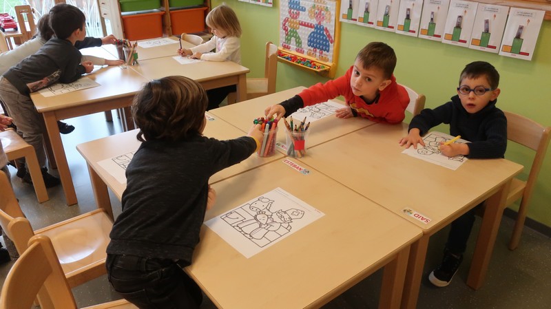 Entrons dans le mois de décembre avec de la neige, un grand calendrier de l’Avent composé de maisons  et …des bonnets pour jouer aux lutins ! Chaque jour, un enfant est tiré au sort et reçoit une maison: la première a été « gagnée » par Emiliano. Les bonnets sont offerts aux moyens et aux grands qui ont rempli la première fiche de bon comportement. Bon week-end à tous !