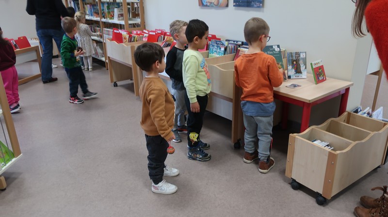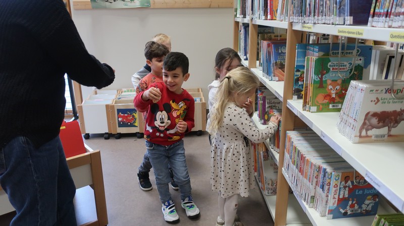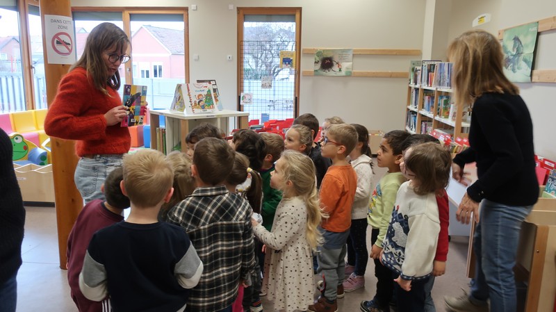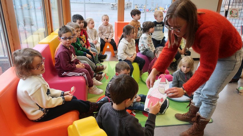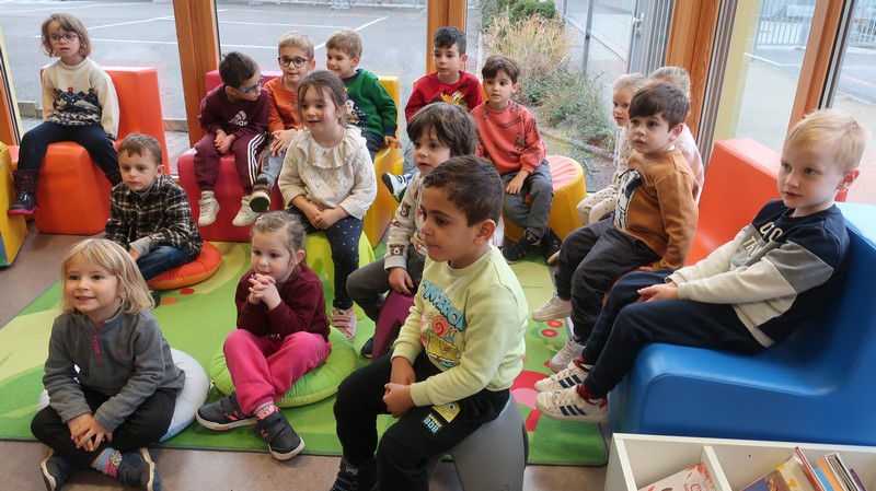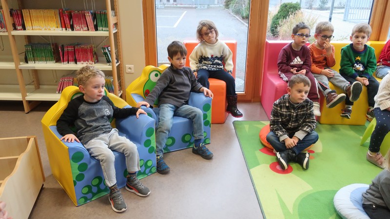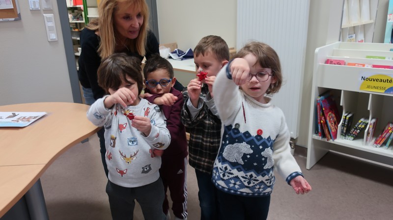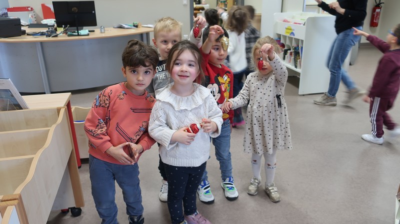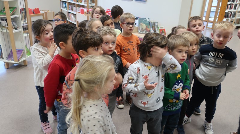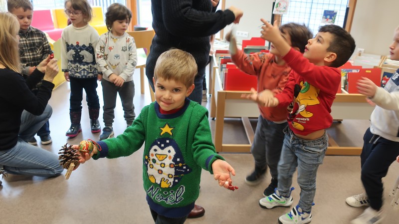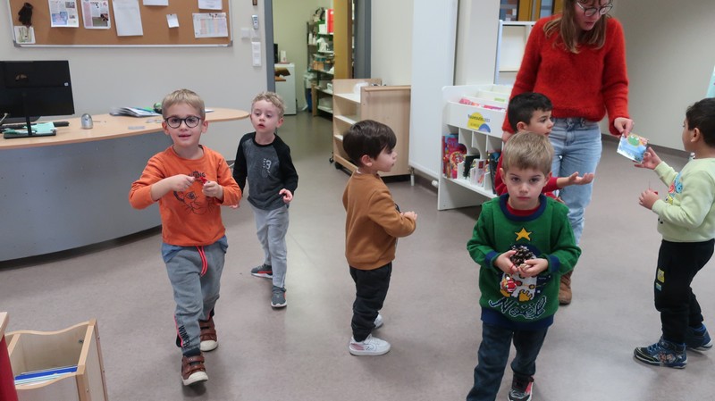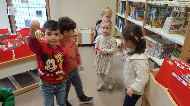 Mardi après-midi, les moyens sont allés à la bibliothèque municipale. Ils ont d’abord suivi Camille et Dominique dans la visite du lieu. Puis ce fut le moment du jeu de piste: à partir d’une photo de certains endroits, les enfants , en équipe, devaient retrouver un objet de Noël. Au total, 4 objets par équipe: tous ont gagné… le droit d’écouter deux histoires de Noël dans lesquelles le Père Noël a envie de changer de vêtements.