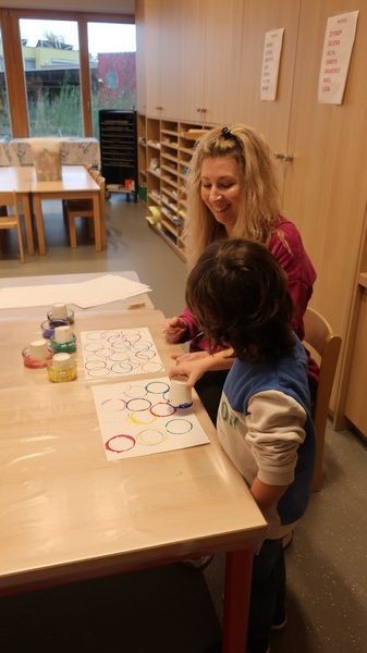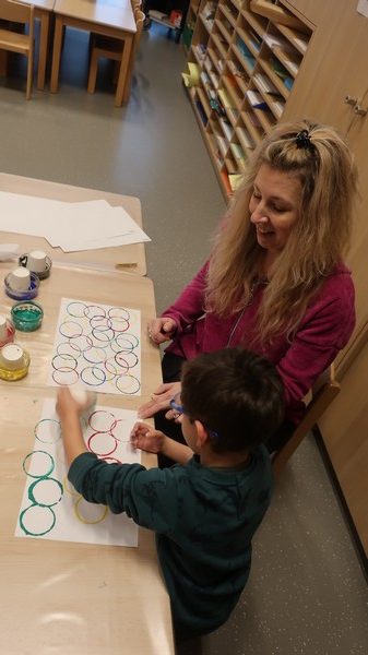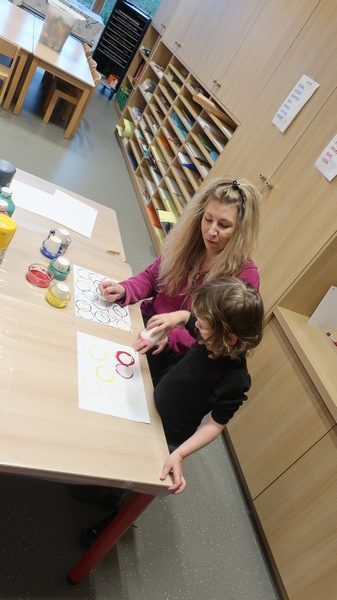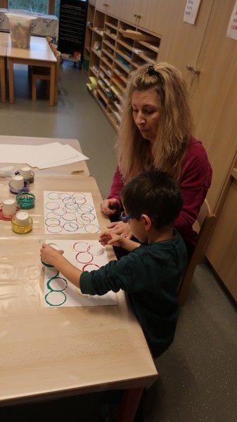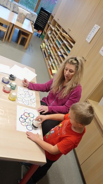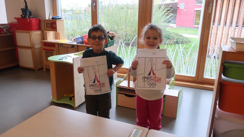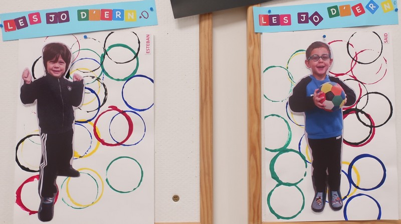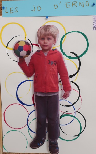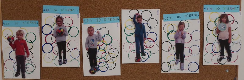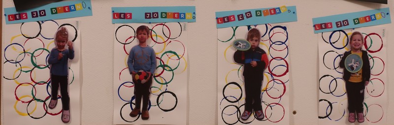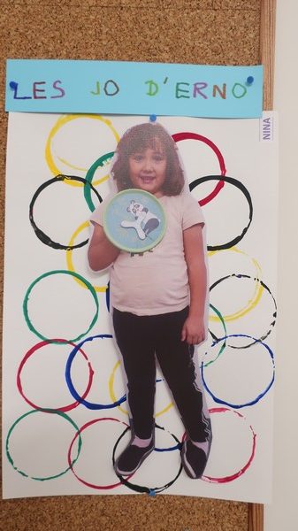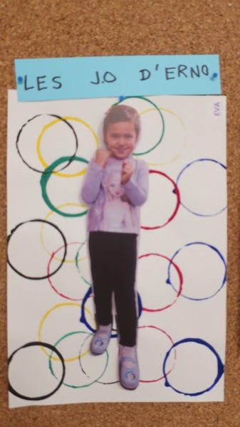 Classe olympique nous sommes, incollables sur les JO nous serons ! Les enfants ont découvert une comptine sur les anneaux et ils ont appris ce que signifiaient les couleurs. Chacun a peint des ronds aux couleurs olympiques et a posé « à la façon d’un sportif » pour la maîtresse. Les moyens ont écrit avec des gommettes la phrase « Les JO d’erno » tandis que les grands ont repassé sur les lettres.