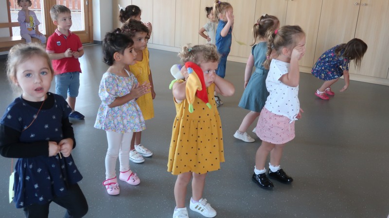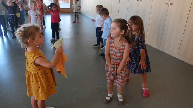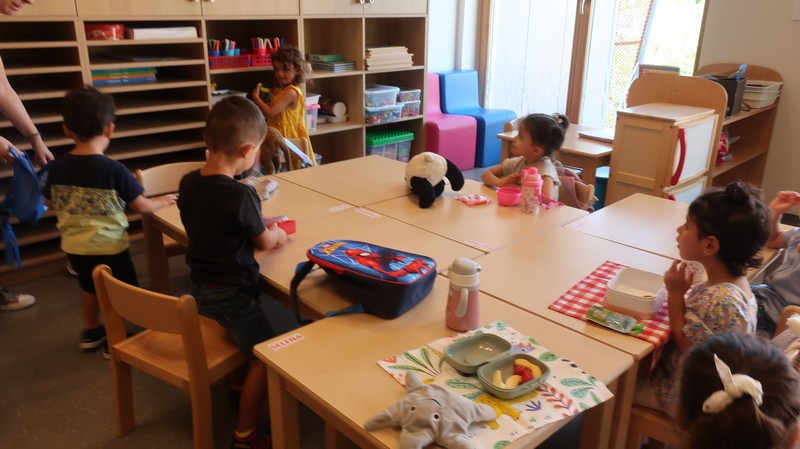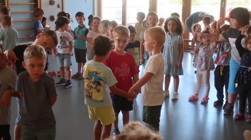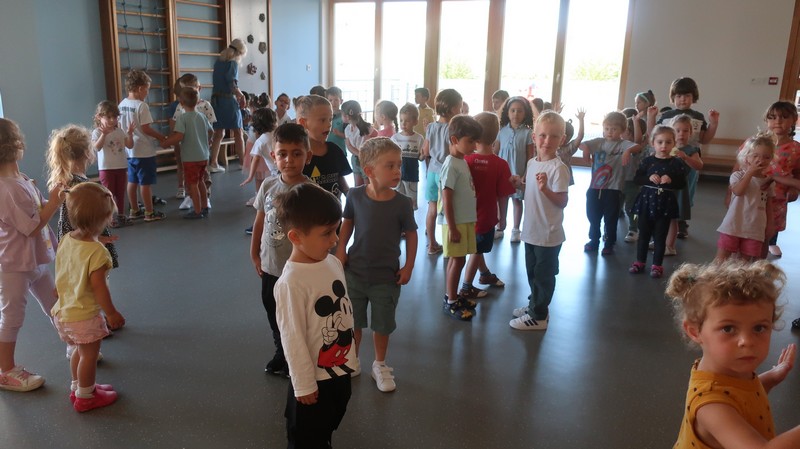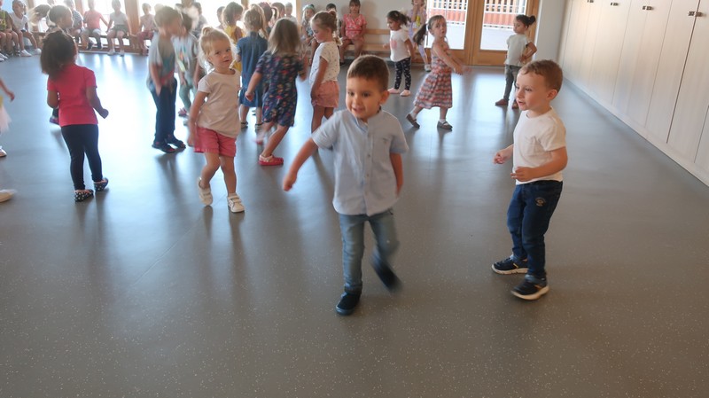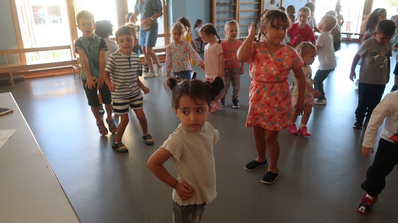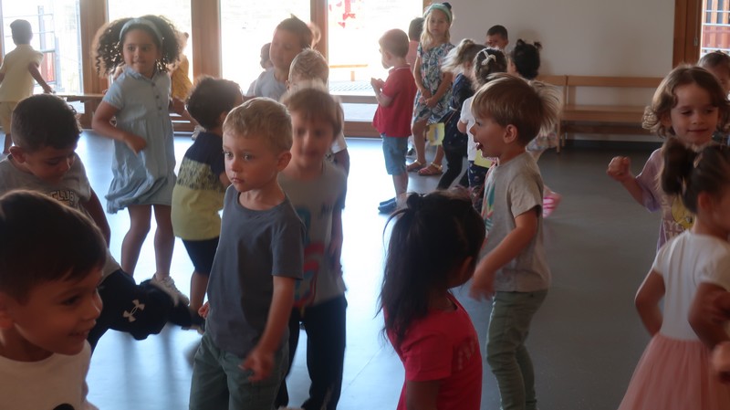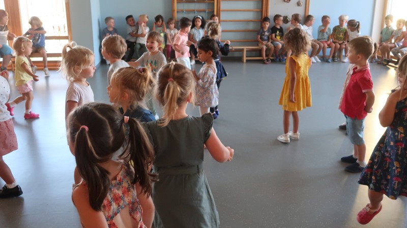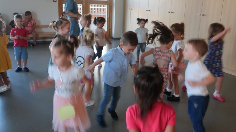 Après le départ des parents, place aux différentes activités: regroupement sur les bancs pour apprendre à se connaître et chanter, aux tables par groupe de couleur et , pour fêter la rentrée en musique, retrouvons la classe de maîtresse Christelle en salle de jeux pour danser : IMG_3304 Au retour de la salle de jeux, c’est l’heure du goûter et enfin de la récréation. Une belle matinée ensoleillée, riche en émotions et en découvertes !