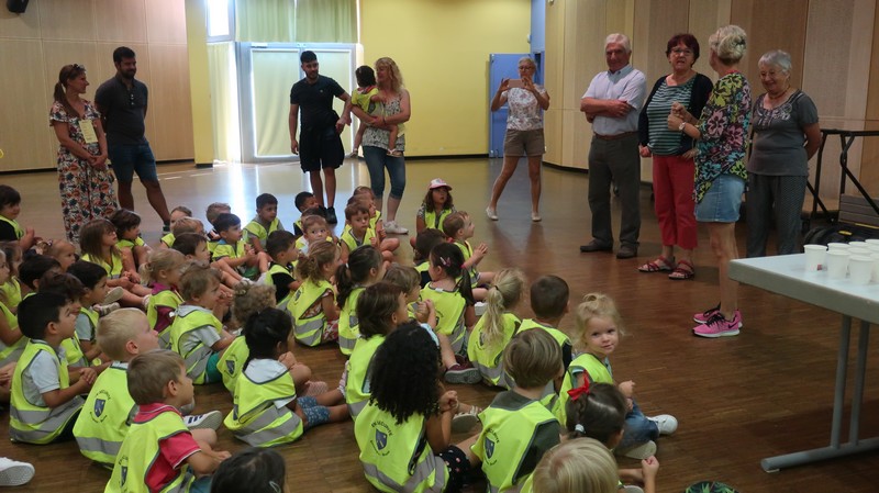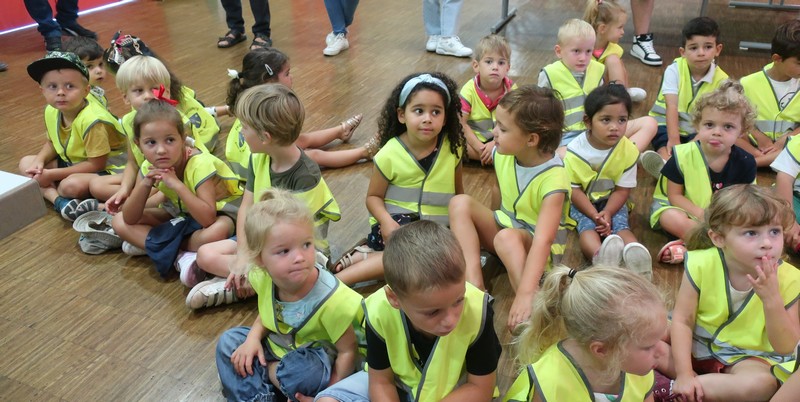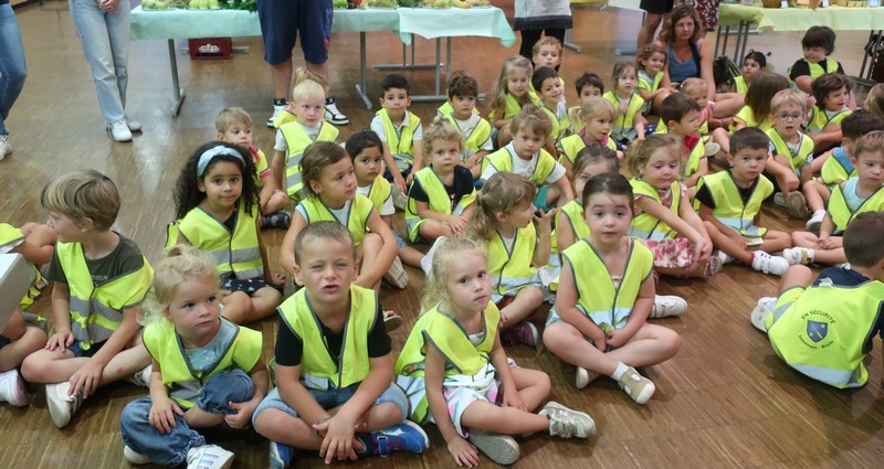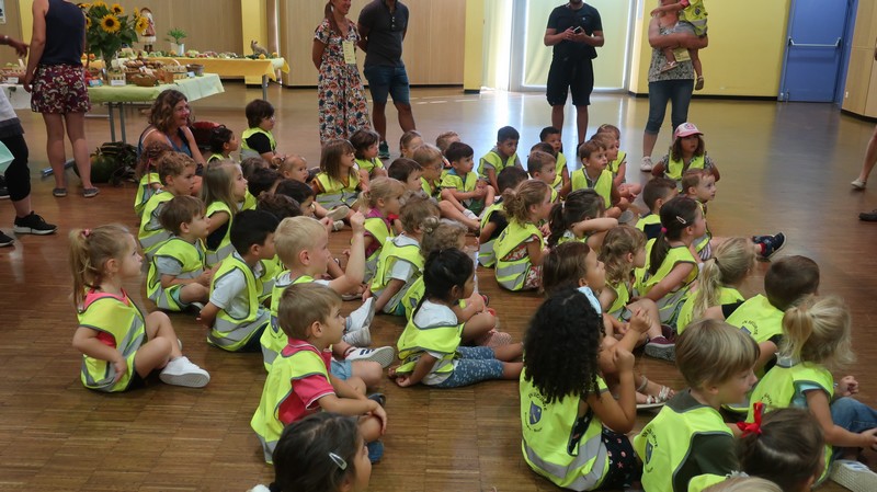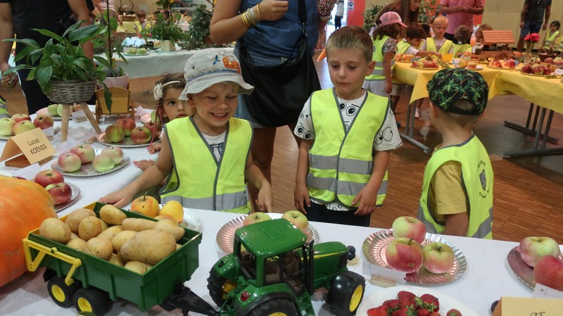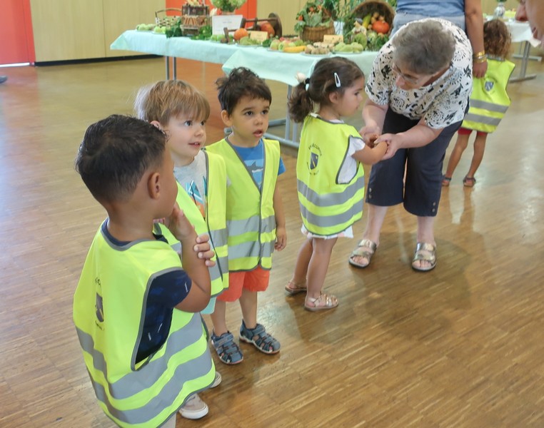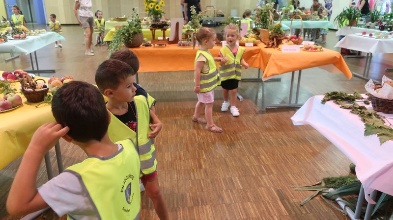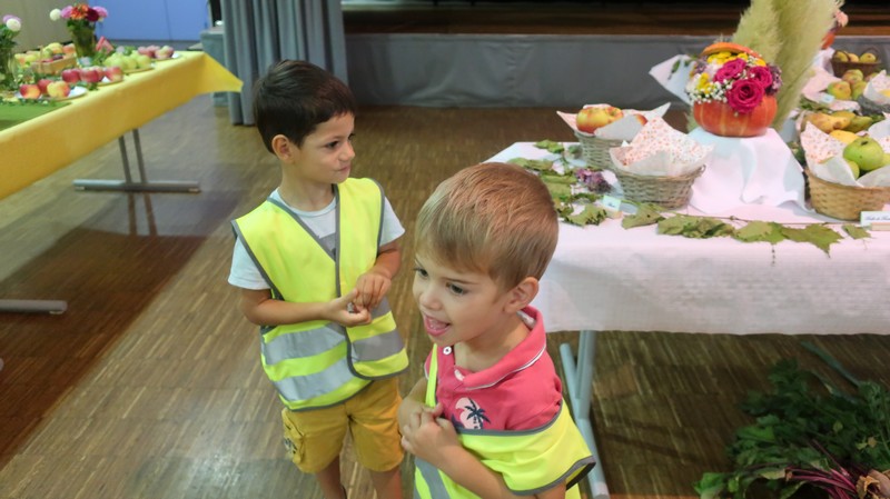 Ce matin, tous les enfants étaient présents pour participer à notre première petite sortie de proximité: l’exposition de fruits et légumes dans la salle socio-culturelle. Equipés de nos gilets de sécurité et bien encadrés par de nombreux parents, nous voilà partis sous un beau soleil… Dans la salle, de nombreuses tables présentaient les fruits, légumes et fleurs de saison, récoltés et mis en valeur par quelques villageois, dont Mr Bentz, président de l’association fleurs et fruits. La visite s’est terminée par quelques chants et la dégustation d’un bon jus de pommes artisanal. Merci aux membres de l’association et aux parents accompagnateurs !