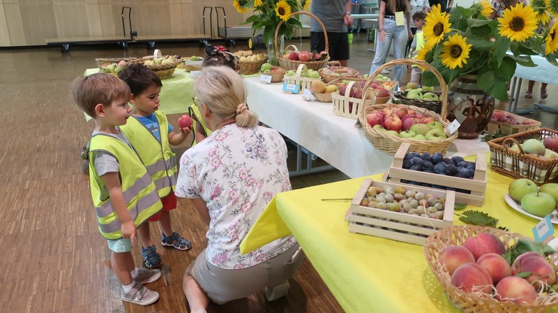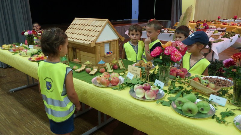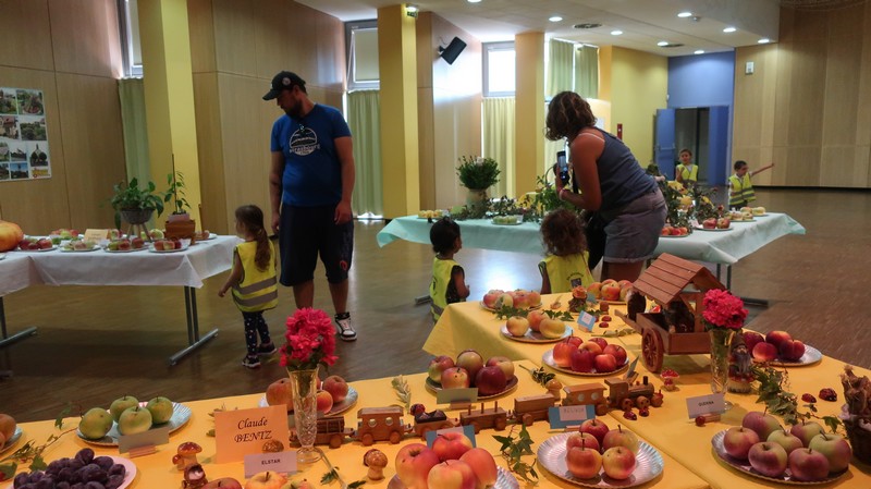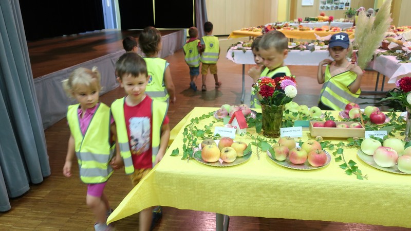 Ce lundi matin, M.Bentz et son équipe nous ont invité à leur exposition sur les fleurs et les fruits. Ce fut l’occasion de découvrir qu’il existe plein de pommes et de poires différentes. Les enfants ont adoré les décors mettant en valeur les productions locales.